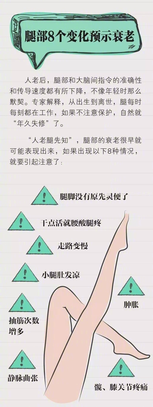 如果把身体比作机器,腿就是提供动力的马达。马达不灵了,机器便会老化、运转不良。除了支撑着全身的重量,腿还有一个不为人知的身份——人体“第二心脏”,养好腿对全身健康至关重要。《生命时报》采访各领域专家,教你呵护双腿。