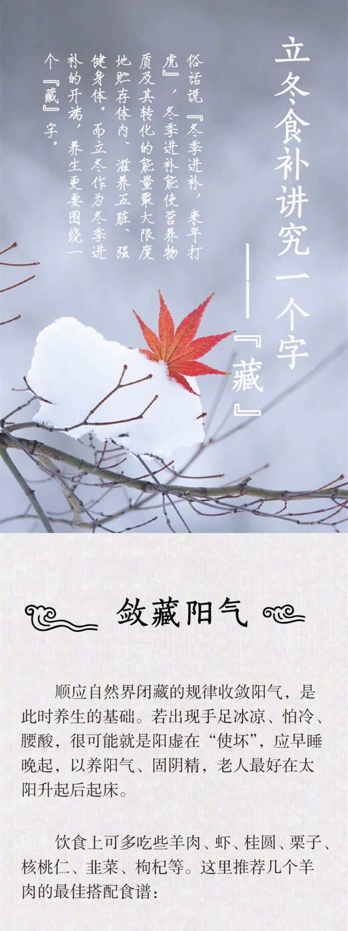 11月7日迎来立冬节气,冬季将正式来临。俗话说“冬季进补,来年打虎”,此时进补能使营养物质及其转化的能量,最大限度地贮存体内、滋养五脏、强健身体。立冬作为冬季进补的开端,养生更要围绕一个“藏”字。