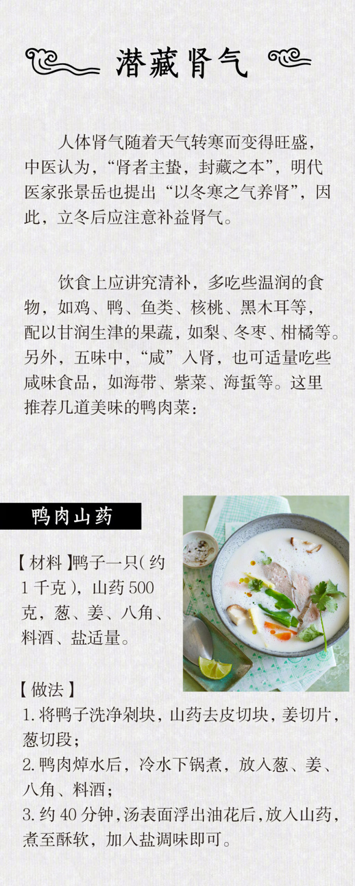 11月7日迎来立冬节气,冬季将正式来临。俗话说“冬季进补,来年打虎”,此时进补能使营养物质及其转化的能量,最大限度地贮存体内、滋养五脏、强健身体。立冬作为冬季进补的开端,养生更要围绕一个“藏”字。