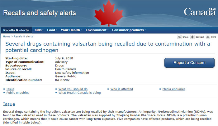 加国生活网小编最新爆料:加拿大卫生部称加拿大一些制药厂家正在紧急召回几种降压药,原因是这些药品所用的原料缬沙坦(valsartan)混入了二甲基亚硝胺(N-nitrosodimethylamine,简称NDMA),NDMA被国际癌症研究机构列为二A类致癌物,即已证明对某些动物致癌、很有可能对人类致癌的物质。它会损害肝脏,长期接触可能导致肝癌。被污染的缬沙坦来自中国浙江华海药业。如果你刚好是高血压患者,正在吃降压药的话,请点击这里查询您的药是否在召回之列。