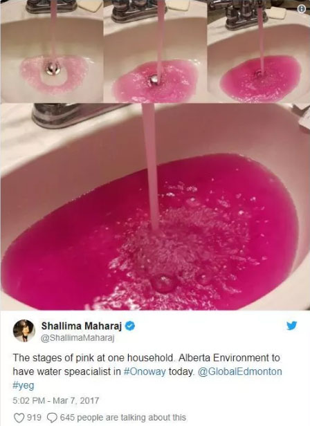后来,阿尔伯塔省又有小镇自来水变成了粉色。事后政府查明原因,颜色变化是由“卡住的阀门”造成的,这使得高锰酸钾(一种化学消毒剂)进入水中。 政府表示,该消毒剂用于处理水,居民们没有任何风险。