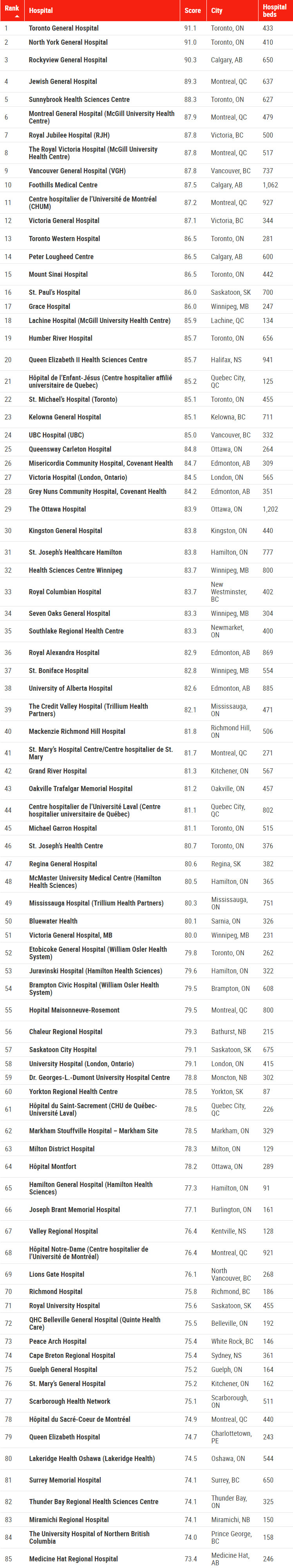 全加拿大排名前85的医院名单: