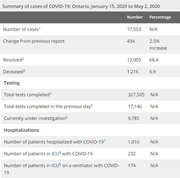 安省方面,截止5月2日上午10:30点,安省已对327505行了新冠病毒检测(检测数较昨天新增17146例),还有9785处于被调查阶段。确诊总数为17553例(比昨天增加了434,确诊率下降至2.5%),包括12005例康复、1216例死亡(截止5月3日死亡又增加到1308例,这是CBC统计的最新死亡数据,死亡人数较昨天增加42例,死亡率上升到7.5%,且仍是加拿大死亡率最高省份)、住院患者1010例(增加33)、进入ICU患者232例(增加11)、ICU插呼吸机患者174例(增加20)。