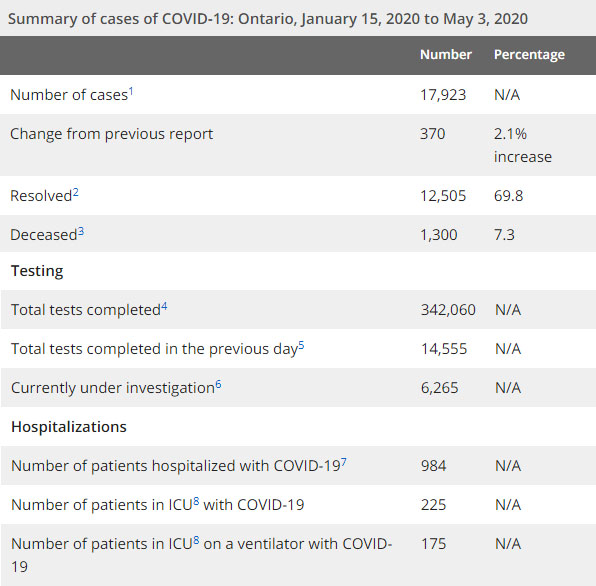 安省方面,截止5月3日上午10:30点,安省已对342060行了新冠病毒检测(检测数较昨天新增14555例),还有6265处于被调查阶段。确诊总数为17923例(比昨天增加了370,确诊率仍为2.5%),包括12005例康复、1300例死亡(截止5月4日死亡又增加到1427例,这是CBC统计的最新死亡数据,死亡人数较昨天爆增119例,死亡率上升到8%,且仍是加拿大死亡率最高省份)、住院患者984例(减少26)、进入ICU患者225例(减少7)、ICU插呼吸机患者175例(增加1)。