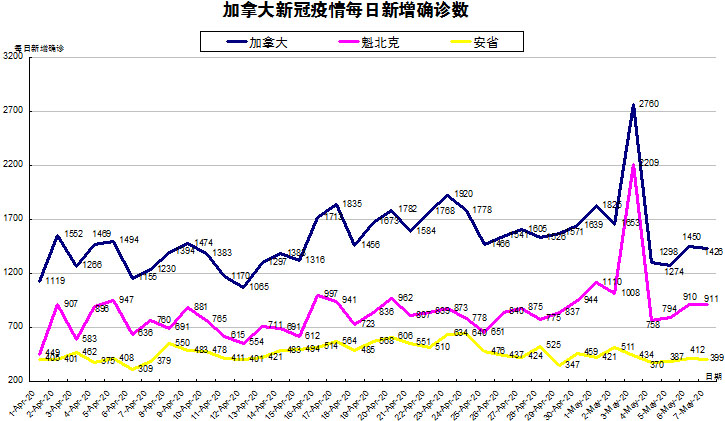 加国生活网小编统计了从4月1日至5月7日每日新增确诊数,制作了如下曲线图,分别统计了全加拿大(蓝色)和确诊数最多的两个省魁北克省(粉色)和安省(黄色)三组数据,大家可以了解一下进行4月份以来加拿大新冠疫情的发展趋势。加拿大、魁省和安省在5月7日新增确诊数均小幅变化,虽然安省为399同昨天412没差太多,但鉴于当天检测数量增加到1.5万例,确诊率其实是从昨天的3.2%下降到2.6%的,因此安省的当天确诊数其实是下降挺多的,期盼能保持住啊!