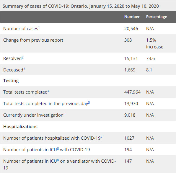 5月10日:安省当日新增病例294创40天内最低 死亡数亦首次低于2位数