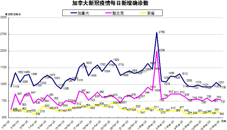 5月3日:魁省单日新增确诊爆增2千多 加拿大总数至59474