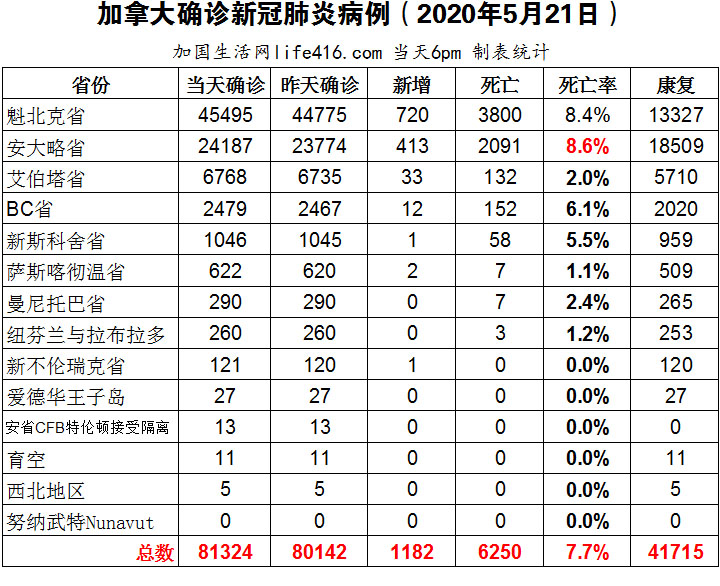 【加国生活网编译报道】截至5月21日下午6点,加拿大确诊新冠病例总数81324,死亡6250。魁省仍是确诊和死亡病例最高省份,确诊总数45495,死亡3800。安省确诊总数24187例(当日新增413),死亡总数2091例(当日新增24),死亡率又降为8.6%。联邦政府愿意帮助各省和地区提高新冠病毒的测试和追踪能力;福特再次对安省迄今为止的测试量表示非常不满意;加拿大出现第二波新冠疫情不可避免;派往安省和魁省的军人中28名确诊;加航取消6月回国往返航班。加国生活网专门制作了如下统计数据表:
