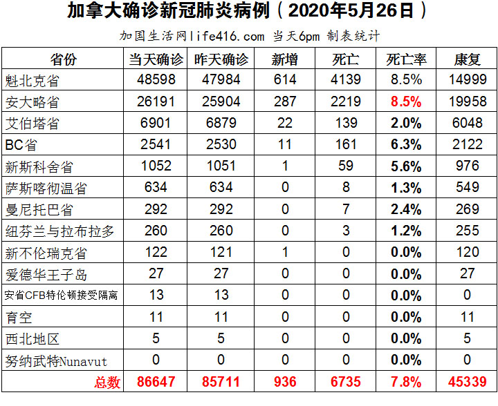 【加国生活网编译报道】截至5月26日下午6点,加拿大确诊新冠病例总数86647,死亡6735。魁省仍是确诊和死亡病例最高省份,确诊总数48598,死亡4139。安省确诊总数26191例(当日新增287),死亡总数2219例(当日新增25),死亡率仍为8.5%。加拿大总理和安省省长皆震惊于军方有关安省养老院的报告;自宣布封闭边境以来,共有近27万人进入加拿大;IKEA今日重启,Winners等店紧随其后明日重启。加国生活网专门制作了如下统计数据表: