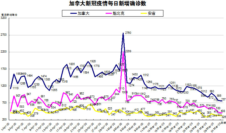 加国生活网小编统计了从4月1日至5月31日每日新增确诊数,制作了如下曲线图,分别统计了全加拿大(蓝色)和确诊数最多的两个省魁北克省(粉色)和安省(黄色)三组数据,大家可以了解一下进行4月份以来加拿大新冠疫情的发展趋势。加拿大、魁省和安省5月31日新增确诊数和昨天相比差不太多,趋势平缓。从整体来看,加拿大已连续六天低于1千以下,且第二天低于800以下,下降趋势明显。