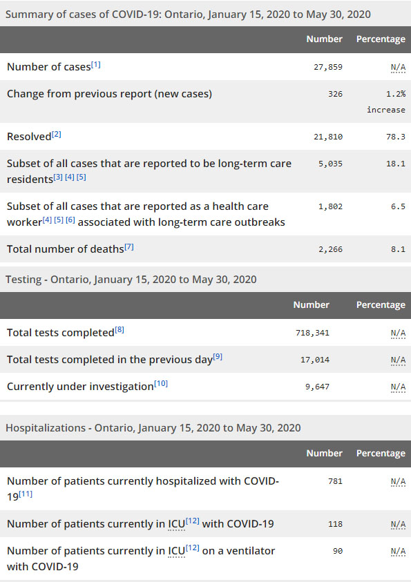 安省方面,截止5月30日上午10:30点,安省已对718341行了新冠病毒检测(检测数较昨天新增17014例),还有9647处于被调查阶段。确诊总数27859(较昨天新增326,确诊率上升至1.9%),包括21810例康复(康复率上升至78.3%)、2266例死亡(截止5月31日死亡又增加到2329例,这是CBC统计的最新死亡数据,死亡人数较昨天增加19例,死亡率仍为8.4%)。好消息继续保持的是:住院患者781例(减少20,本月已继续八天低于900例,第一天低于800例,而且一天比一天低);进入ICU患者118例(减少3);ICU插呼吸机患者90例(增加6)。