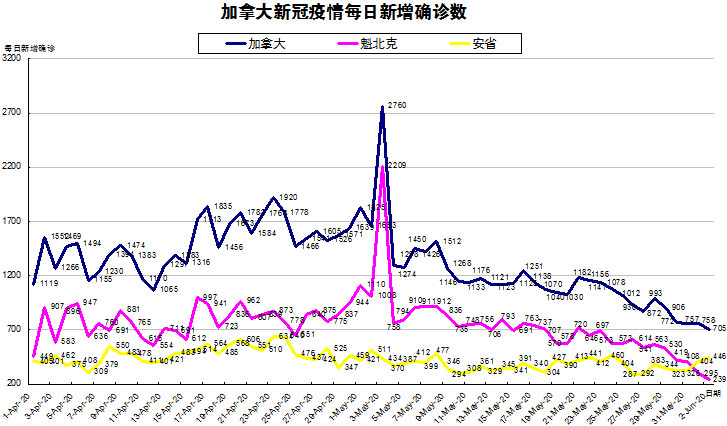 加国生活网小编统计了从4月1日至6月2日每日新增确诊数,制作了如下曲线图,分别统计了全加拿大(蓝色)和确诊数最多的两个省魁北克省(粉色)和安省(黄色)三组数据,大家可以了解一下进行4月份以来加拿大新冠疫情的发展趋势。6月2日,加拿大和魁省新增确诊数都有所下降,魁省下降最大至239,而安省却连续二日反超魁省达到446例!小编真是欲哭无泪,何时是个头啊!
