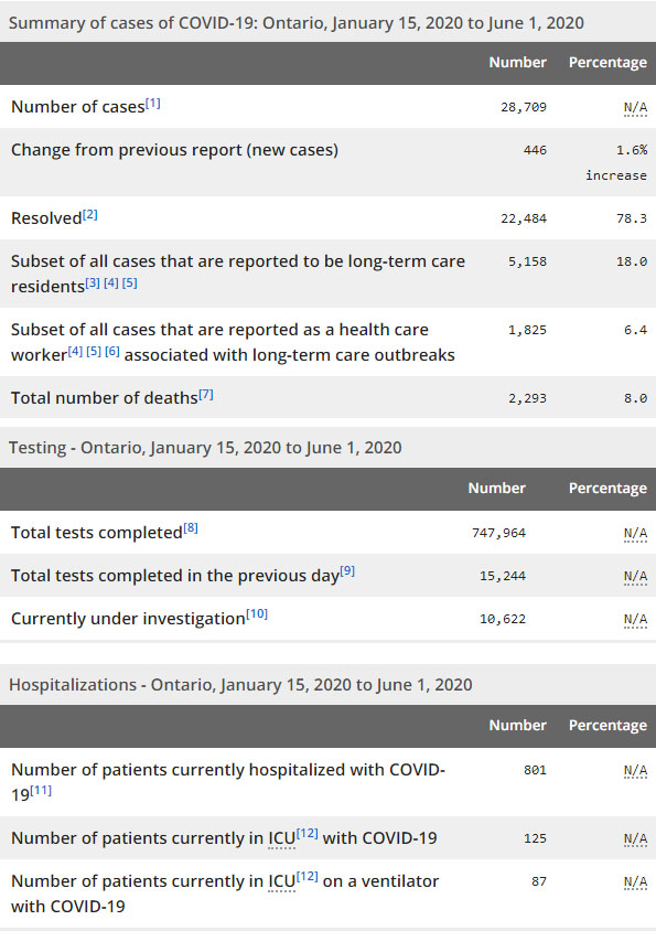 安省方面,截止6月1日上午10:30点,安省已对747964行了新冠病毒检测(检测数较昨天新增15244例,这是进入6月以来连续二日没有达到1.6万的测试目标),还有10622处于被调查阶段。确诊总数28709(较昨天新增446,确诊率上升至2.9%),包括22484例康复(康复率下降至78.3%)、2293例死亡(截止6月2日死亡又增加到2356例,这是CBC统计的最新死亡数据,死亡人数较昨天增加20例,死亡率下降至8.2%)。住院患者801例(增加20例);进入ICU患者125例(未变);ICU插呼吸机患者87例(减少2)。