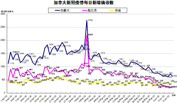 加国生活网小编统计了从4月1日至6月7日每日新增确诊数,制作了如下曲线图,分别统计了全加拿大(蓝色)和确诊数最多的两个省魁北克省(粉色)和安省(黄色)三组数据,大家可以了解一下进行4月份以来加拿大新冠疫情的发展趋势。6月7日,加拿大新增确诊数较昨天再次下降,又返回700以下至642。魁省较昨天没有太大变化,总体趋势仍保持下降趋势。安省则依旧在400以上至415,不过这415中包括“数据从实验室递交给公共卫生部门通报的过程中出现延迟而导致的”223例,当日新增病例才有192。安省这两天混乱的数据让人无所适从,小编只能从最坏的情况来考虑,权当6月7日新增415例好了。