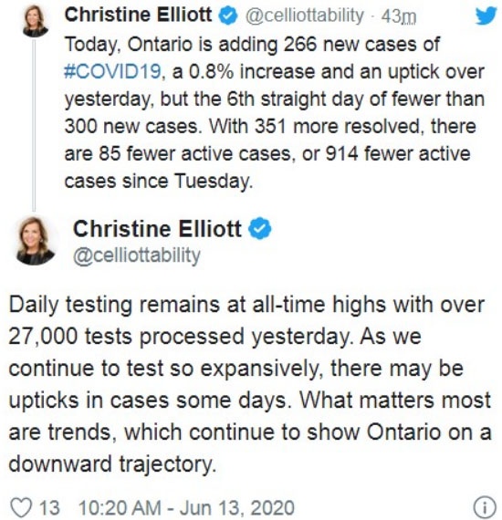 安省卫生厅长叶丽雅(Christine Elliott)6月13日在Twitter上表示,“现在每天测试量保持在历史最高水平,昨天处理了27,000多个测试。 随着我们继续进行如此广泛的测试,虽然在某些情况下的某些日子可能会有问题,但最重要的是趋势,该趋势继续表明安省疫情正处于下降趋势。”