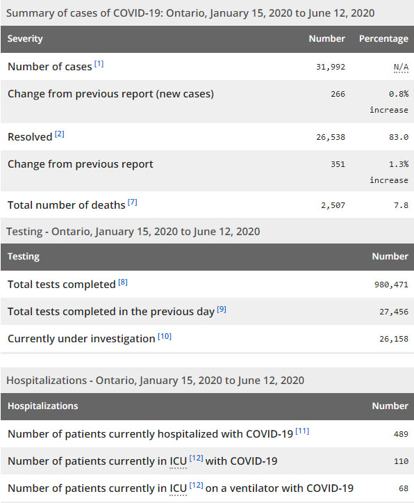 再看看安省方面的详细数据,截止6月12日上午10:30点,安省已对980471行了新冠病毒检测(检测数较昨天新增27456例),还有26158处于被调查阶段。确诊总数31992(较昨天新增266,确诊率上升至0.97%),包括26538例康复(康复率为83%)、2507例死亡(截止6月13日死亡又增加到2563例,这是CBC统计的最新死亡数据,死亡人数较昨天增加10例,死亡率仍为8.0%)。住院患者489例(减少38例,首日少于500以下);进入ICU患者110例(减少4);IU插呼吸机患者68例(减少16)。