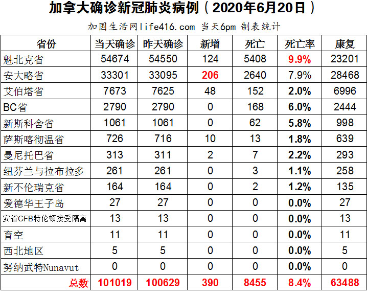 【加国生活网编译报道】截至6月20日下午6点,加拿大确诊新冠病例总数101019(当日新增390),死亡8455。魁省确诊总数54674(当日新增124,连续4日低于200),死亡5408,死亡率仍为9.9%。安省确诊总数33301例(当日新增206,再次高于200),死亡总数2640例(当日新增26例)。加拿大漏报了许多和新冠有关的死亡病例;从6月23日起乘坐Via Rail乘客必须戴口罩或面罩;许多加拿大人想知道加美两国边境的目前现状是怎样的?加国生活网专门制作了如下统计数据表:
