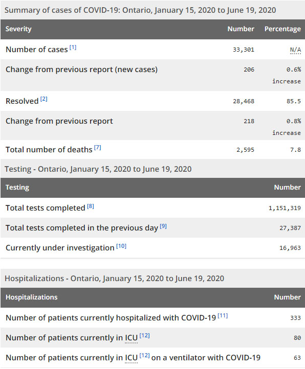 再看看安省方面的详细数据,截止6月19日上午10:30点,安省已对1151319例行了新冠病毒检测(检测数较昨天新增27387例),还有16963处于被调查阶段。确诊总数33301(较昨天新增206,确诊率上升至0.75%),包括28468例康复(康复率为85.5%)、2595例死亡(截止6月20日死亡又增加到2640例,这是CBC统计的最新死亡数据,死亡人数较昨天增加26例,死亡率为7.9%)。住院患者333例(增加2例,连续4日少于400以下);进入ICU患者80例(减少2);IU插呼吸机患者63例(减少2)。
