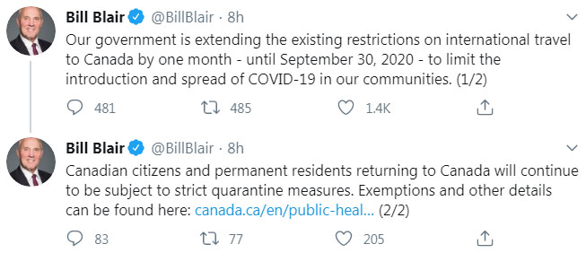 —— 加拿大公共安全部长Bill Blair 在8月28日发推特说,加拿大旅游禁令(禁止一切非加拿大公民、永久居民或出于重要原因从美国入境)又延长了一个月至9月30日。此外,原定于8月31日到期的加拿大与美国之间的过境协议也是一直持续到9月21日。