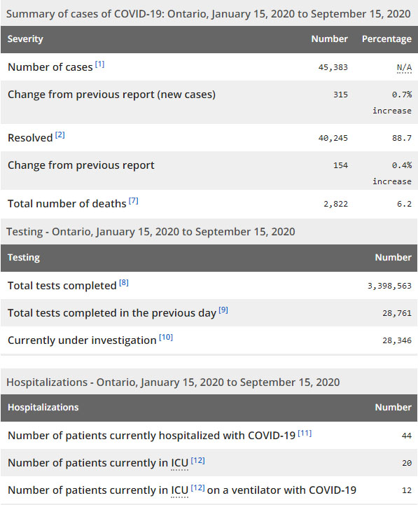 再看看安省方面的详细数据,截止9月15日,安省已对3,398,563例行了新冠病毒检测(检测数较昨天新增28761),还有28346处于被调查阶段。确诊总数45383(较昨天新增315,确诊率上升为1.1%),包括40245例康复(康复率下降仍为88.7%)、2822例死亡(截止9月16日死亡2864例,这个数据是CBC新闻是基于各地公共卫生部门的数据进行统计的,该方法避免了省级报告系统的滞后时间。死亡人数较昨天增加2例,死亡率下降仍为6.3%)。住院患者44例(减少3);进入ICU患者20例(增加1);IU插呼吸机患者12例(增加1)。