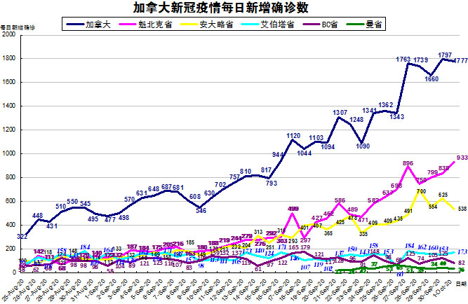由于加拿大目前的疫情格局已经不再是魁省和安省确诊病例最多的情况了,其他几个省份也渐渐开始加重起来,“第二波”疫情已经到来,所以加国生活网小编统计了从8月25日至10月1日的五个省份的新增确诊数,并制作了如下曲线图,大家可以了解一下加拿大目前新冠疫情的发展趋势。加拿大较昨天有小小下降,从昨天的1797下降至今天的1777。当日按新增确诊数按省份排列分别是:魁省新增933、安省新增538、艾省新增173、BC省新增82、曼省新增36。