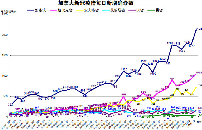 由于加拿大目前的疫情格局已经不再是魁省和安省确诊病例最多的情况了,其他几个省份也渐渐开始加重起来,“第二波”疫情已经到来,所以加国生活网小编统计了从8月25日至10月2日的五个省份的新增确诊数,并制作了如下曲线图,大家可以了解一下加拿大目前新冠疫情的发展趋势。加拿大较昨天有大幅上升,从昨天的1777上升至今天的2124。当日按新增确诊数按省份排列分别是:魁省新增1052、安省新增732、BC省新增161、艾省新增122、曼省新增43。