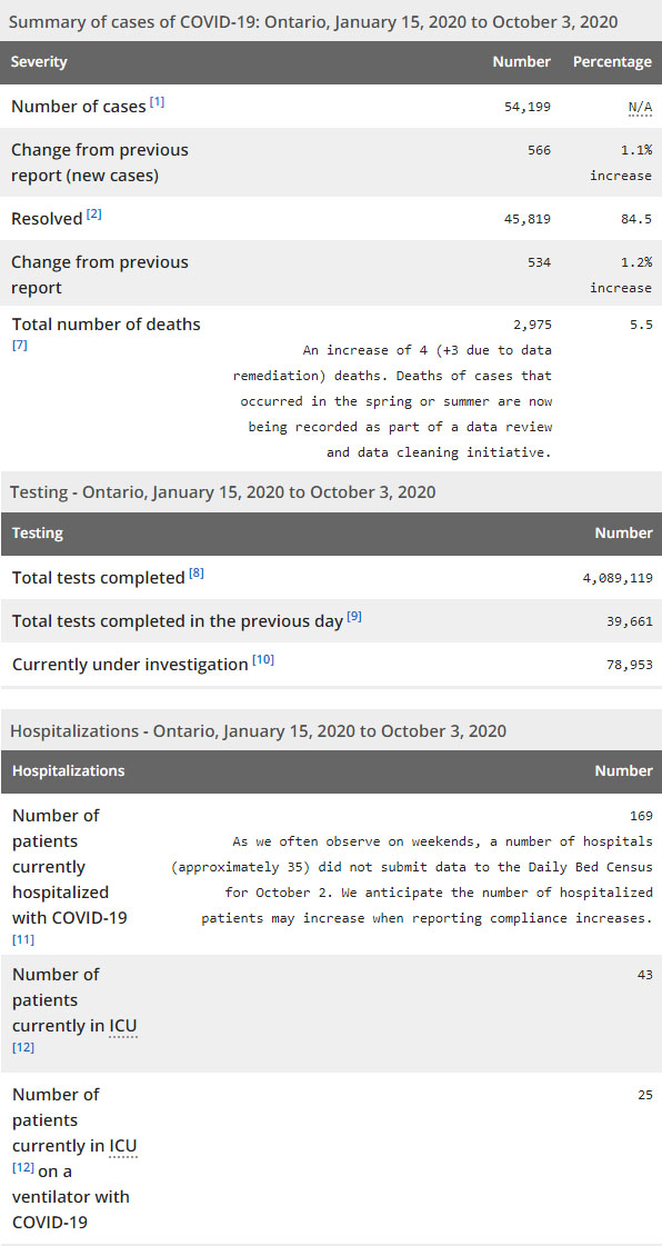 再看看安省方面的详细数据,截止10月3日,安省已对4,089,119例行了新冠病毒检测(检测数较昨天新增39,661),还有78,953处于被调查阶段。确诊总数54,199(较昨天新增566,确诊率上升为1.42%),包括45,819例康复(康复率上升为84.5%)、2,975例死亡(其中新增的3例属于春季或夏季的死亡病例,现在已作为数据审查和数据清理计划的一部分进行记录,死亡率仍为5.5%)。住院患者169例(增加14);进入ICU患者43例(增加2);IU插呼吸机患者25例(增加2)。