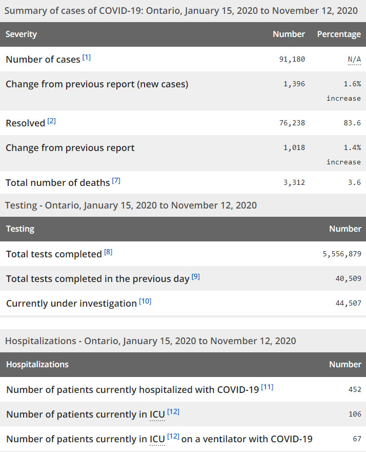再看看安省方面的详细数据,截止11月12日,安省已对5,556,879例进行了新冠病毒检测(检测数较昨天新增40,509),还有44,507处于被调查阶段。确诊总数91,180(较昨天新增1396,确诊率下降为3.44%),包括76,238例康复(康复率下降为83.6%)、3312例死亡(较昨天增加19例,死亡率下降为3.6%)。住院患者452例(增加21);进入ICU患者106例(增加8);IU插呼吸机患者67例(增加5)。