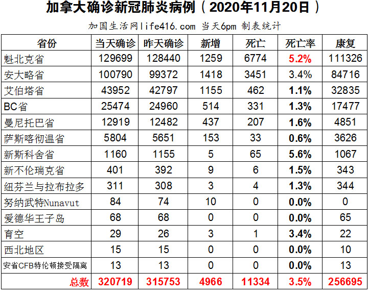 【加国生活网编译报道】截至11月20日下午6点,加拿大新冠确诊病例总数为320719(新增4966),死亡11334(新增69)。魁省确诊总数129699(新增1259);安省确诊总数100790(新增1418);艾省确诊总数43952(新增1155);BC省确诊总数25474(新增514);曼省确诊总数12919(新增437);萨省确诊总数5804(新增153)。艾省疫情有赶超安省和魁省趋势,但省府仍未决定采取任何新卫生措施;安省确诊病例总数突破10万,省长宣布多伦多和皮尔区将从11月23日起开始实行“封锁”。加国生活网专门制作了如下统计数据表:
