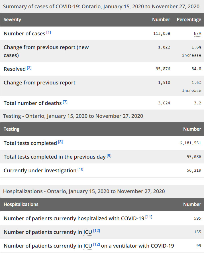 再看看安省方面的详细数据,截止11月27日,安省已对6,181,551例进行了新冠病毒检测(检测数较昨天新增55,086),还有56,219处于被调查阶段。确诊总数113,038(较昨天新增1822,确诊率上升为3.31%),包括95,876例康复(康复率仍为84.8%)、3625例死亡(较昨天增加29例,死亡率仍为3.2%)。住院患者595例(增加54);进入ICU患者155例(增加4);IU插呼吸机患者99例(减少2)。