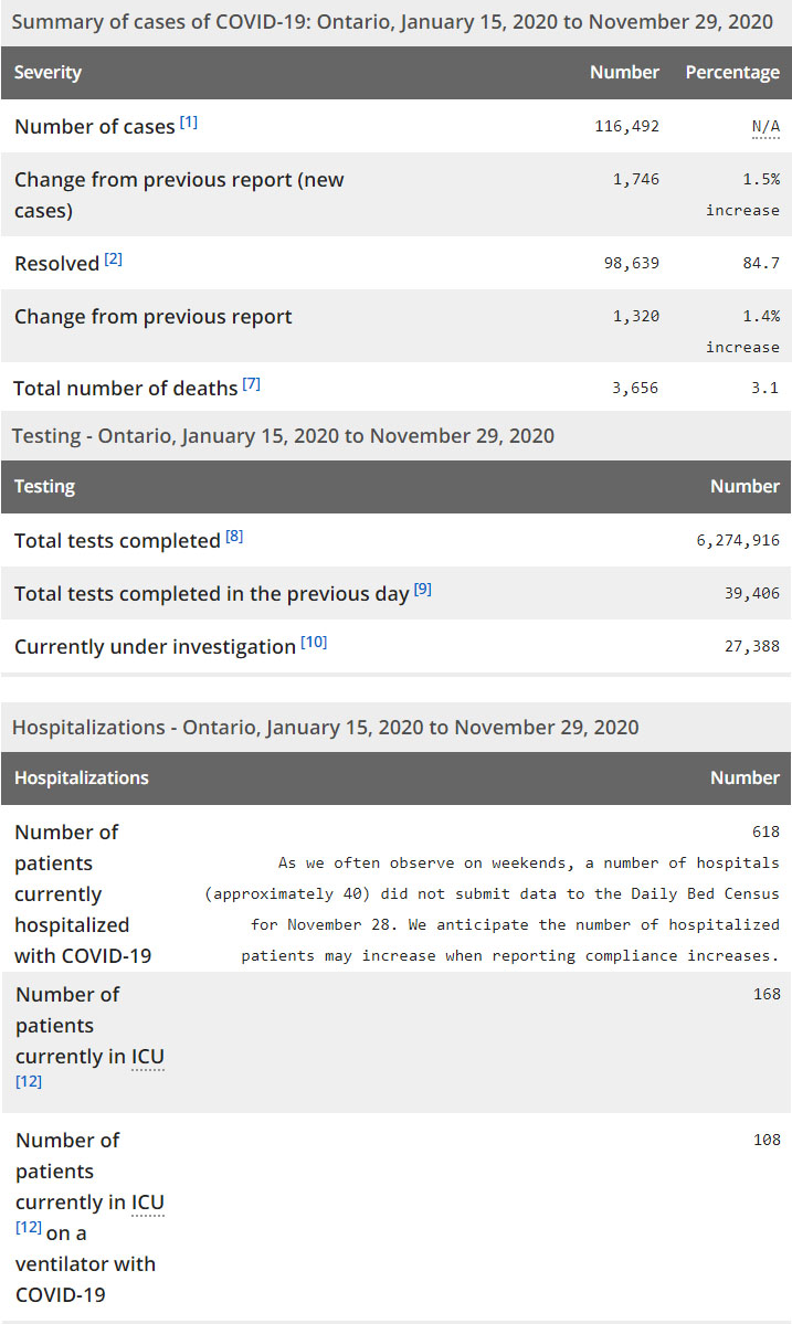再看看安省方面的详细数据,截止11月29日,安省已对6,274,916例进行了新冠病毒检测(检测数较昨天新增39,406),还有27,388处于被调查阶段。确诊总数116,492(较昨天新增1746,确诊率上升至4.43%),包括96,639例康复(康复率下降为84.7%)、3656例死亡(较昨天增加8例,死亡率下降为3.1%)。住院患者618例(增加32,约有40家医院没有提交数据);进入ICU患者168例(增加12);IU插呼吸机患者108例(增加17)。