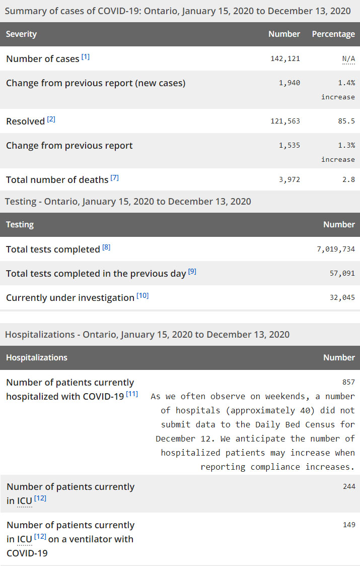 再看看安省方面的详细数据,截止12月13日,安省已对7,019,734例进行了新冠病毒检测(检测数较昨天新增57,091),还有32,045处于被调查阶段。确诊总数142,121(较昨天新增1940,确诊率上升至3.4%),包括121,563例康复(康复率下降为85.5%)、3972例死亡(较昨天增加23例,死亡率仍为2.8%)。住院患者857例(增加44);进入ICU患者244例(减少9);IU插呼吸机患者149例(增加7)。