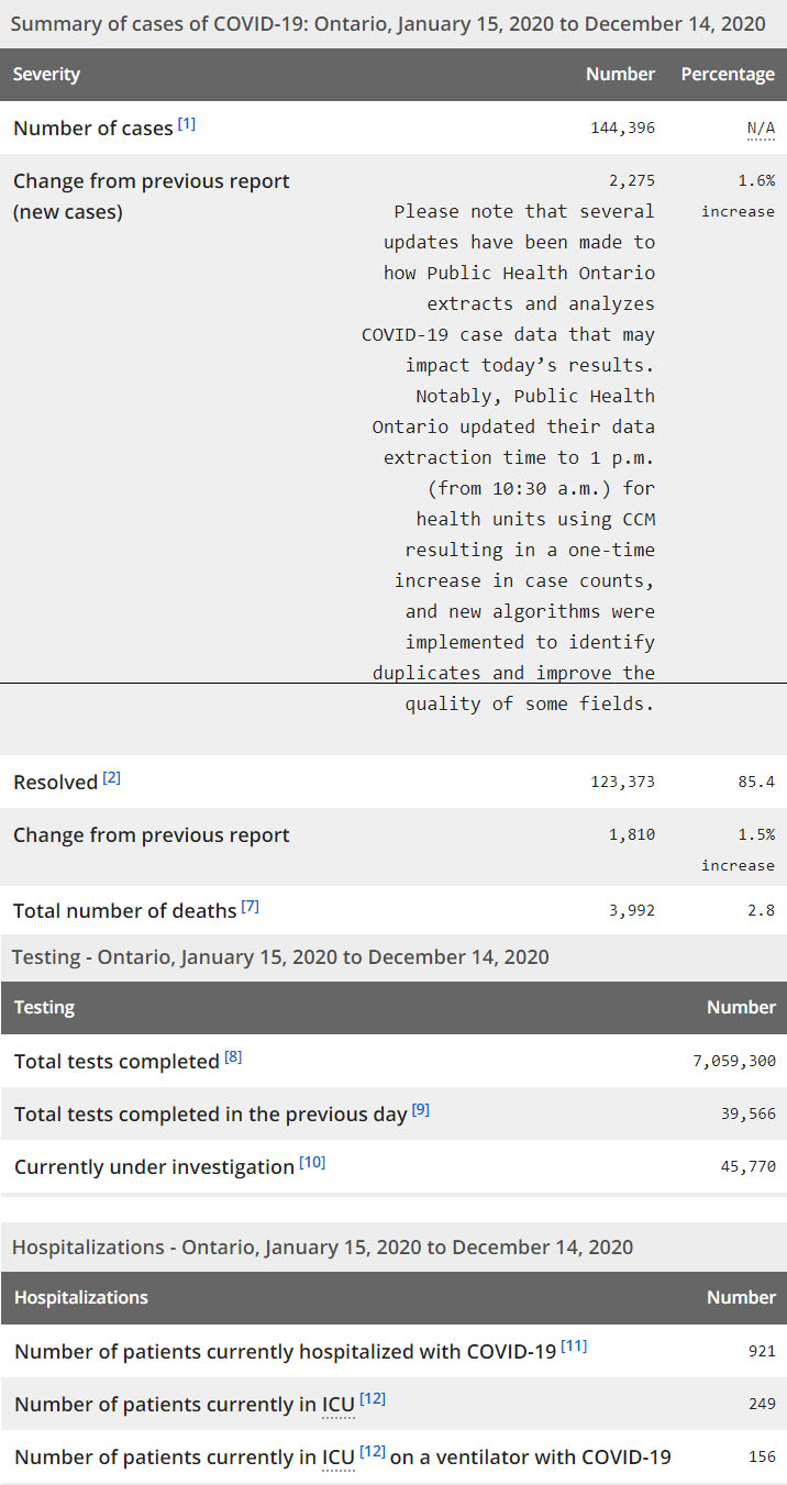 再看看安省方面的详细数据,截止12月14日,安省已对7,059,300例进行了新冠病毒检测(检测数较昨天新增39,566),还有45,770处于被调查阶段。确诊总数144,396(较昨天新增2275,确诊率上升至5.75%),包括123,373例康复(康复率下降为85.4%)、3992例死亡(较昨天增加20例,死亡率仍为2.8%)。住院患者921例(增加64);进入ICU患者249例(增加5);IU插呼吸机患者156例(增加7)。