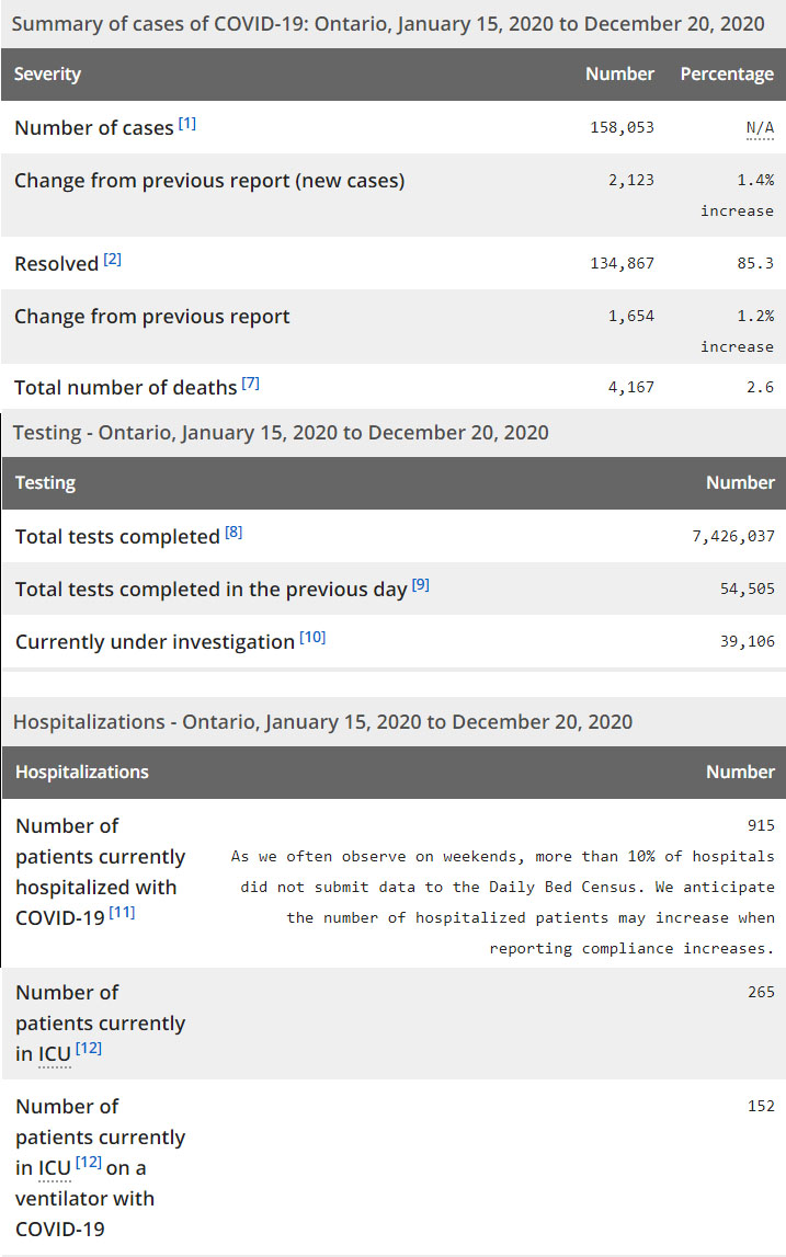 再看看安省方面的详细数据,截止12月20日,安省已对7,426,037例进行了新冠病毒检测(检测数较昨天新增54,505),还有39,106处于被调查阶段。确诊总数158,053(较昨天新增2123,确诊率上升至3.9%),包括134,867例康复(康复率下降为85.3%)、4167例死亡(较昨天增加17例,死亡率下降为2.6%)。住院患者915例(增加40);进入ICU患者265例(增加4);IU插呼吸机患者152例(减少4)。