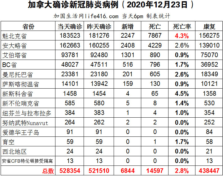 【加国生活网编译报道】截至12月23日下午6点,加拿大新冠确诊病例总数为528354(新增6844),死亡14597(新增172)。魁省确诊总数183523(新增2247);安省确诊总数162663(新增2408);艾省确诊总数93781(新增1301);BC省确诊总数48027(新增516);曼省确诊总数23381(新增201);萨省确诊总数14101(新增159)。加拿大卫生部监管部门在完成了对Moderna疫苗的各种临床试验数据的审查之后,终于在12月23日批准了Moderna疫苗可在加拿大境内针对18岁以上人群使用;有关可在加拿大注射的两种新冠疫苗的Q/A。加国生活网专门制作了如下统计数据表:
