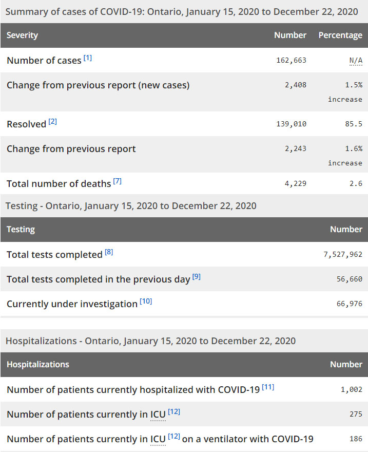 再看看安省方面的详细数据,截止12月22日,安省已对7,527,962例进行了新冠病毒检测(检测数较昨天新增56,660),还有66,976处于被调查阶段。确诊总数162,663(较昨天新增2408,确诊率下降至4.25%),包括139,010例康复(康复率上涨至85.5%)、4229例死亡(较昨天增加41例,死亡率仍为2.6%)。住院患者1002例(减少3);进入ICU患者275例(增加2);IU插呼吸机患者186例(增加14)。