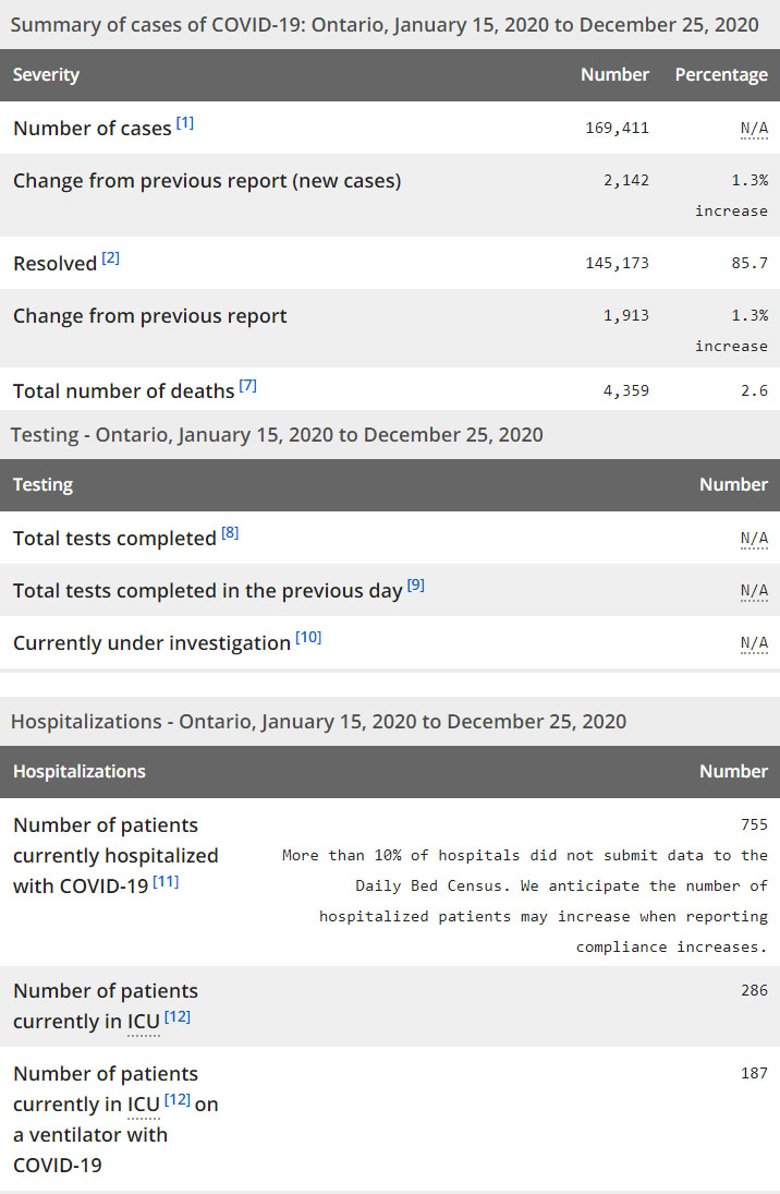 再看看安省方面的详细数据,截止12月25日,安省没有更新新冠病毒检测数据。确诊总数169,411(两天新增4301,昨天新增2142),包括145,173例康复(康复率上升至85.7%)、4359例死亡(两天增加81例,死亡率仍为2.6%)。住院患者755例(减少212,部分数据没有更新);进入ICU患者286例(增加9);IU插呼吸机患者187例(增加11)。