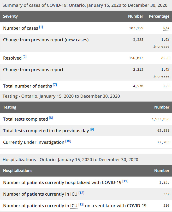 再看看安省方面的详细数据,截止12月30日,安省已对7,922,058例进行了新冠病毒检测(检测数较昨天新增63,858),还有72,283处于被调查阶段。确诊总数182,159(较昨天新增2923,确诊率下降至4.58%),包括156,012例康复(康复率下降至85.6%)、4530例死亡(增加56例,死亡率仍为2.5%)。住院患者1235例(增加58);进入ICU患者337例(增加14);IU插呼吸机患者210例(增加6)。