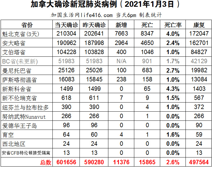 【加国生活网编译报道】截至2021年1月3日下午6点,加拿大新冠确诊病例总数为601656(3天新增11376),死亡15865(3天新增151)。魁省确诊总数210304(3天新增7663);安省确诊总数190962(新增2964);艾省确诊总数104228(新增400);曼省确诊总数25126(新增100);萨省确诊总数16083(新增238);BC省因新年假期未更新。加拿大新增确诊总数正式迈入60万“里程碑”,从50万到60万又用了15天;加拿大就业部长表示CRSB从未鼓励加拿大人不遵守公共卫生或国际旅行准则;魁省三天共新增7663例确诊病例;安省教育部长表示学校是安全的,中小学将在1月如期开学。加国生活网专门制作了如下统计数据表: