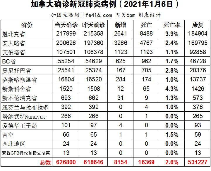 【加国生活网编译报道】截至2021年1月6日下午6点,加拿大新冠确诊病例总数为626800(新增8154),死亡16369(新增136)。魁省确诊总数217999(新增2641);安省确诊总数200626(新增3266);艾省确诊总数107501(新增1123);BC省确诊总数55254(新增625);曼省确诊总数25541(新增167);萨省确诊总数16804(新增284)。加拿大要求持72小时新冠检测阴性证明登机的规定正式开始执行,没有推迟;魁省将从1月9日起实行全省宵禁一个月至2月8日;安省将在未来几天决定是否需要采取更严格的封锁措施,包括可能关闭学校;安省为国际旅客提供免费新冠测试服务。加国生活网专门制作了如下统计数据表:
