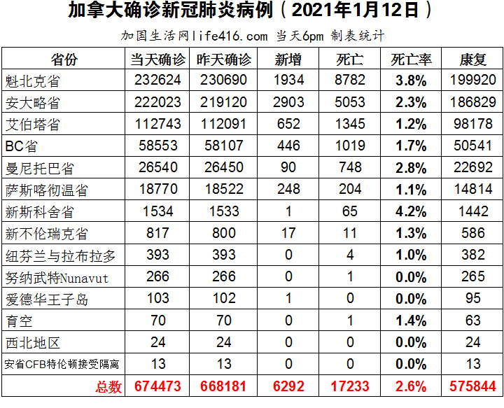 【加国生活网编译报道】截至2021年1月12日下午6点,加拿大新冠确诊病例总数为674473(新增6292),死亡17233(新增147)。魁省确诊总数232624(新增1934);安省确诊总数222023(新增2903);艾省确诊总数112743(新增652);BC省确诊总数58553(新增446);曼省确诊总数26540(新增90);萨省确诊总数18770(新增248)。加拿大再订2千万剂辉瑞疫苗以确保为整个加拿大人群接种疫苗;加美边境限制延长至2月21日;安省最新疫情模型显示正处于“危险点”,若新病例增长速度达到5%,到2月中旬每天将新增2万例,故安省在当天宣布更严格“居家令”,从1月14日至2月11日生效。加国生活网专门制作了如下统计数据表: