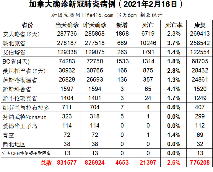 【加国生活网编译报道】截至2021年2月16日下午6点,加拿大新冠确诊病例总数为831577(4天新增4653,当天新增2388),死亡21397(4天新增85例)。安省确诊总数287736(2天新增1868,当天新增904);魁省确诊总数278187(新增669);艾省确诊总数129338(新增263);BC省确诊总数74283(4天新增1533,当天新增302);曼省确诊总数30932(2天新增166,当天新增96);萨省确诊总数26829(新增136)。加拿大首席公共卫生官警告称至少有四个省份报告了变异新冠病毒正在社区传播的证据;魁省新增669例确诊病例,创自9月25日以来的最低每日数字;安省许多医学专家包括都认为变异病毒所引发的确诊病例正在令人震惊地上升,省府应考虑学校开放可能带来的风险。加国生活网专门制作了如下统计数据表: