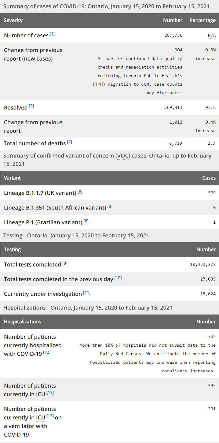 再看看安省方面的详细数据,截止2月15日,安省已对10,433,272例进行了新冠病毒检测(检测数较昨天新增27,005),还有15,024处于被调查阶段。确诊总数287,736(2天新增1868,当天新增904,阳性率上升为3.35%。多伦多公共卫生部(TPH)数据库迁移到安省卫生部数据库CCM之后,作为持续的数据质量检查和补救活动的一部分,病例数可能会有所波动),包括269,413例康复(康复率上升至93.6%)、6,719例死亡(2天增加87例,死亡率仍为2.3%)。住院患者742例(减少21);进入ICU患者292例(减少3);IU插呼吸机患者201例(减少3)。