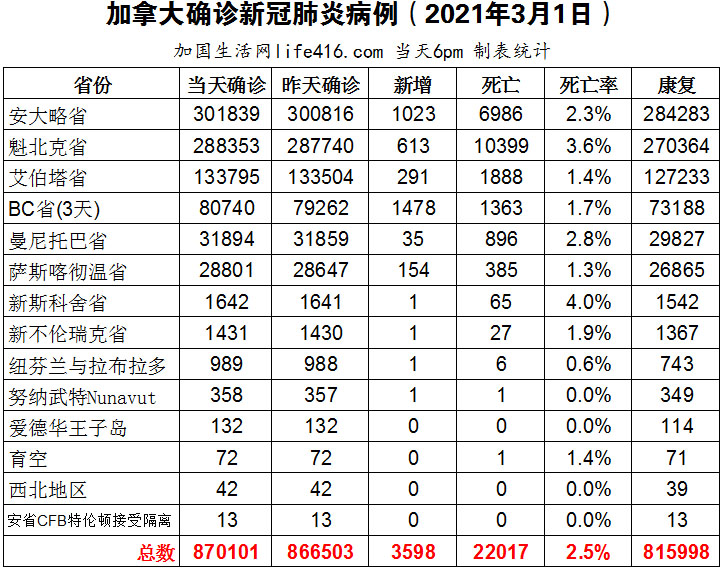 【加国生活网编译报道】截至2021年3月1日下午6点,加拿大新冠确诊病例总数为870101(3天新增3598,当天新增2558),死亡22017(3天新增23)。安省确诊总数301839(新增1023);魁省确诊总数288353(新增613);艾省确诊总数133795(新增291);BC省确诊总数80740(3天新增1478,当天新增438);曼省确诊总数31894(新增35);萨省确诊总数28801(新增154)。BC省决定将三种疫苗的第一剂和第二剂接种时间间隔延长到16周即四个月;安省卫生部疫苗接种预约系统进入“试运行”阶段;约克区开放疫苗接种预约系统,为区内80岁以上居民预约接种疫苗,2小时2万个名额全部被预约。加国生活网专门制作了如下统计数据表: