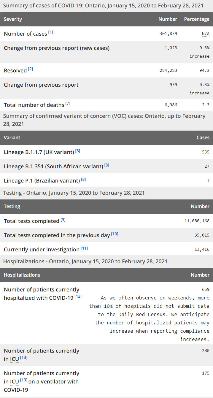 再看看安省方面的详细数据,截止2月28日,安省已对11,080,168例进行了新冠病毒检测(检测数较昨天新增35,015),还有13,416处于被调查阶段。确诊总数301,839(当天新增1023,阳性率上升至2.92%),包括284,283例康复(康复率仍为94.2%)、6,986例死亡(增加6例,死亡率仍为2.3%)。住院患者659例(增加32,有10%医院没有更新数据);进入ICU患者280例(减少9);IU插呼吸机患者175例(减少10)。
