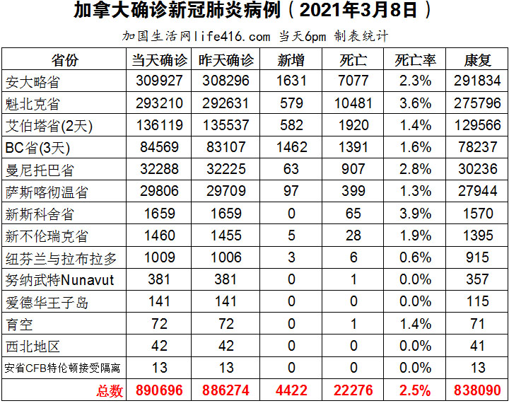 【加国生活网编译报道】截至2021年3月8日下午6点,加拿大新冠确诊病例总数为890696(3天新增4422,当天新增3041),死亡22276(3天新增37)。安省确诊总数309927(新增1631);魁省确诊总数293210(新增579);艾省确诊总数136119(2天新增582,当天新增278);BC省确诊总数84569(3天新增1462,当天新增385);曼省确诊总数32288(新增63);萨省确诊总数29806(新增97)。加拿大将3月11日定为纪念新冠死者的“纪念日”;BC省疫苗接种预约电话被打爆,第一个小时接到一百万个电话;魁省宣布不遵循加拿大国家疫苗专家小组关于AstraZeneca疫苗的建议,将对70多岁老年人群使用该疫苗;安省新增1631例确诊病例,创一个多月以来的最高记录,包括新增63例变异病毒病例;多伦多启动了疫苗接种预约网站和预约电话热线。加国生活网专门制作了如下统计数据表: