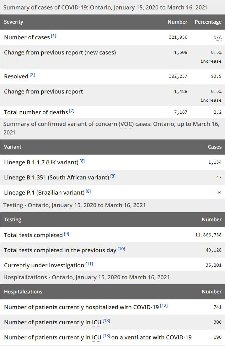 再看看安省方面的详细数据,截止3月16日,安省已对11,866,738例进行了新冠病毒检测(检测数较昨天新增49,128),还有35,201处于被调查阶段。确诊总数321,956(当天新增1508,阳性率下降至3.07%),包括302,257例康复(康复率仍为93.9%)、7,187例死亡(增加14例,死亡率仍为2.2%)。住院患者741例(减少20);进入ICU患者300例(增加8);IU插呼吸机患者190例(减少4)。