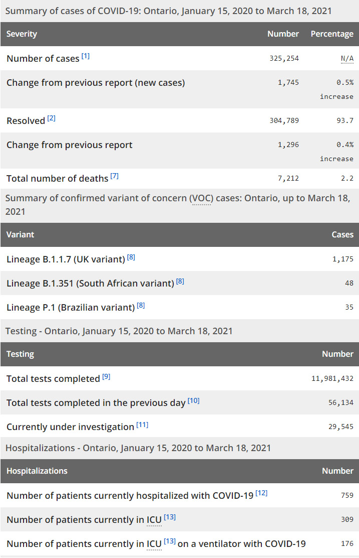 再看看安省方面的详细数据,截止3月18日,安省已对11,981,432例进行了新冠病毒检测(检测数较昨天新增56,134),还有32,330处于被调查阶段。确诊总数323,509(当天新增1553,阳性率上升至2.77%),包括304,789例康复(康复率下降为93.7%)、7,212例死亡(增加10例,死亡率仍为2.2%)。住院患者759例(增加29);进入ICU患者309例(增加5);IU插呼吸机患者176例(减少10)。