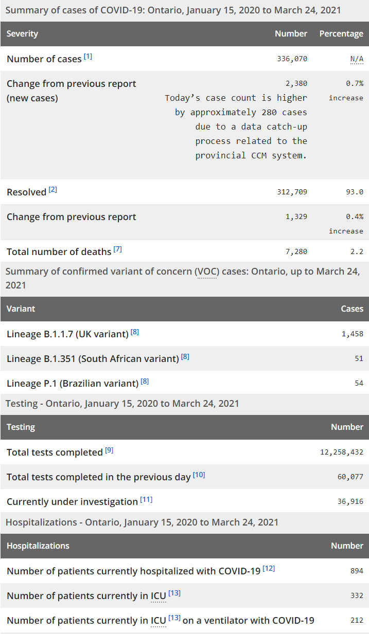 再看看安省方面的详细数据,截止3月24日,安省已对12,258,432例进行了新冠病毒检测(检测数较昨天新增60,077),还有36,916处于被调查阶段。确诊总数336,070(当天新增2380,有280例属于数据库系统遗漏案例,阳性率上升至3.96%),包括312,709例康复(康复率仍为93.0%)、7,280例死亡(增加17例,死亡率仍为2.2%)。住院患者894例(增加1);进入ICU患者332例(减少1);IU插呼吸机患者212例(增加2)。