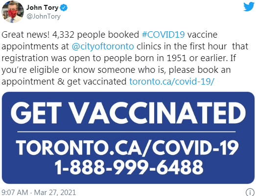 —— 多伦多市长庄德利在3月26日宣布,多伦多年龄在70岁以上的市民可以从3月27日起预约接种新冠疫苗。庄德利表示,从3月22日起预约接种疫苗的人数一直在下降,当时3月22日开放预约的年龄设定在75岁以上。从3月27日开始,1951年或更早出生的人可以通过安省预约门户网站预约疫苗接种时间。3月27日一早,庄德利发推文表示,在向70岁以上年龄段人群开放预约的第一个小时,就有4332人进行了疫苗预约。多伦多公共卫生局表示,迄今为止,多伦多市已接种了453,932剂疫苗,未来一周多伦多将提供约30,000个接种疫苗的机会。